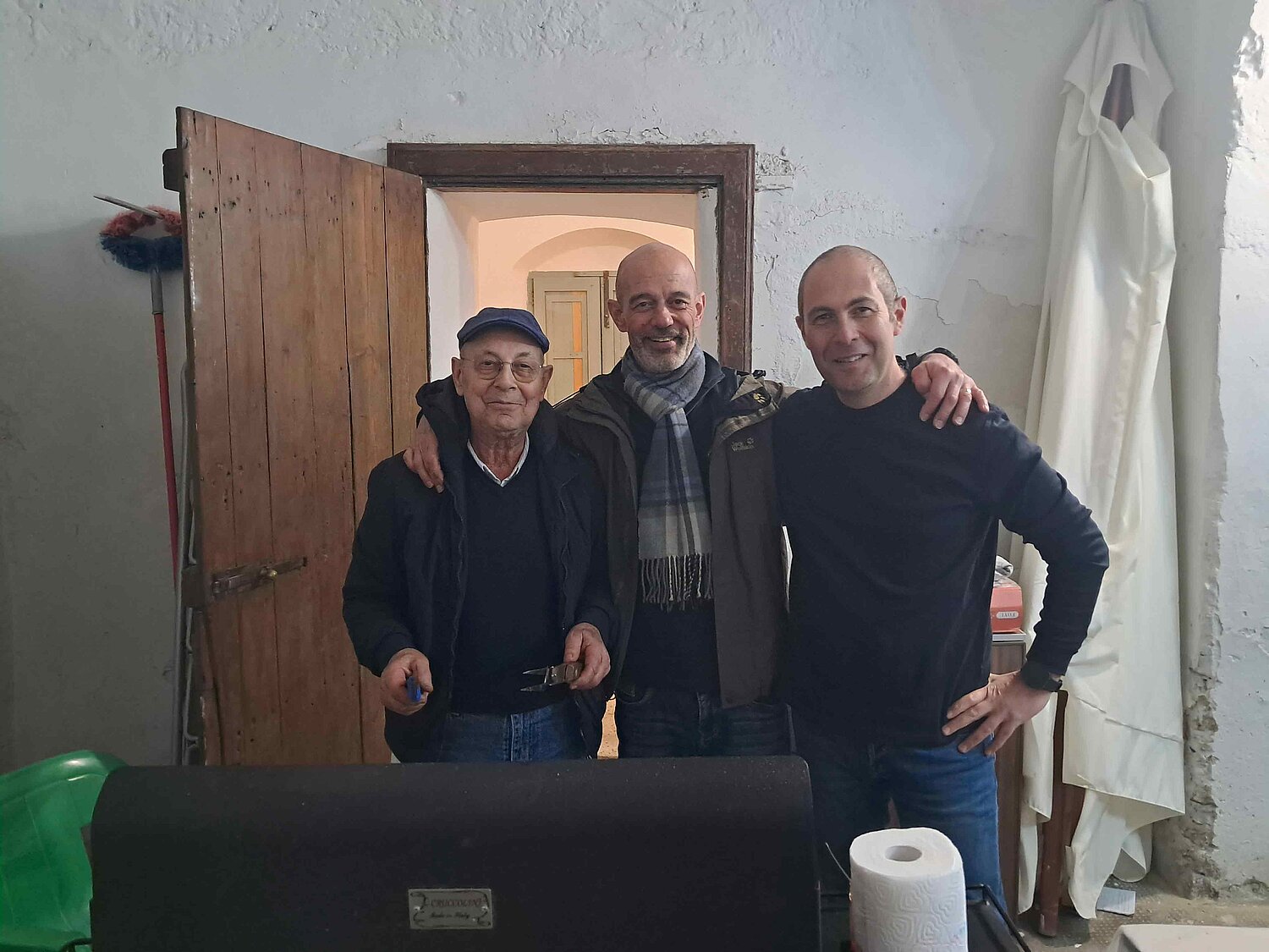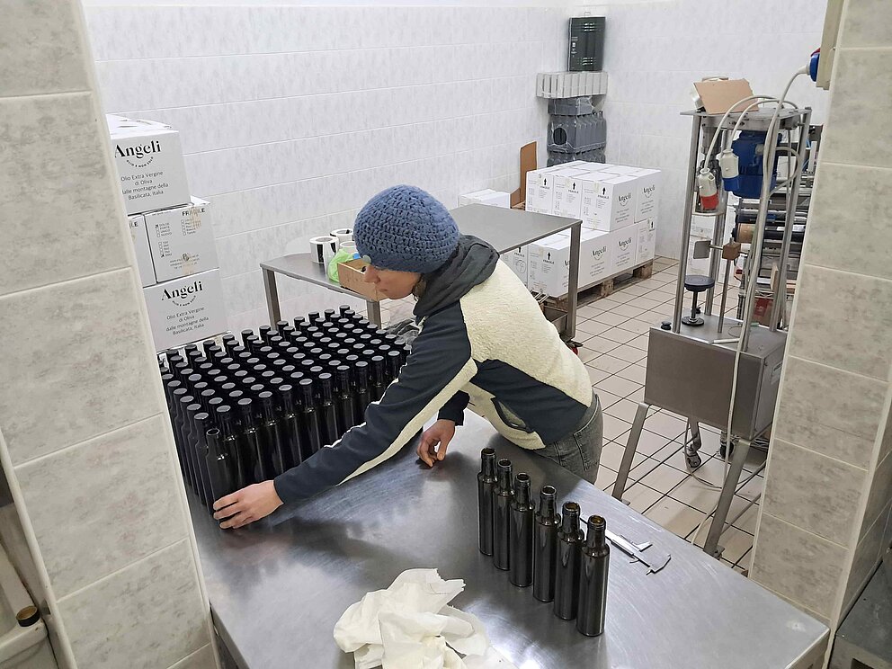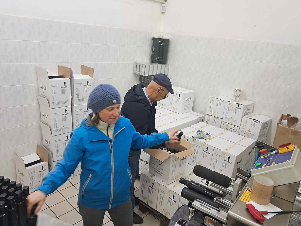 Am Samstagmorgen treffen wir uns um 08.30 Uhr zum traditionellen Morgen-Cafè in der Bar. Wir werden von Pietro, Papà und ihren Freunden herzlich begrüsst. Frisch gestärkt geht es anschliessend in die Ölmühle, wo wir zuerst die Angeli Berg-Olivenöle des Jahrgangs 2025 noch einmal degustieren. Ich habe grosse Freude an diesem Jahrgang. Die Laborwerte, unter anderem die freie Fettsäure und der Polyphenolgehalt sind einmal mehr auf einem Topniveau. Geschmacklich überzeugen die Olivenöle mit einer frischen, grünen Aromatik und gut eingebundener Bitterkeit, die sich einmal etwas präsenter (FORTE, UNICO) und einmal etwas dezenter (DOLCE) zeigt. Durch den durchwegs hohen Polyphenolgehalt hat auch das DOLCE dieses Jahr bereits eine etwas präsentere Schärfe im Abgang als das in anderen Jahrgängen der Fall war. Aber Angeli Berg-Olivenölgeniesser:Innen wissen ja bereits: das Kratzen am Hals (ausgelöst von den Polyphenolen) ist ein Qualitätsmerkmal und verleiht dem Angeli Berg-Olivenöl Charakter. Nachdem wir uns von der Qualität der Angeli Berg-Olivenöle vergewissert haben, machen wir uns umgehend an die Abfüllung. Dabei handelt es sich um einen komplett manuellen Prozess. Zuerst werden jeweils 4 Flaschen gleichzeitig in die Abfüllmaschine gestellt. Das Olivenöl fliesst bis zum definierten Füllstand in die Flaschen. Diese werden dann aus der Abfüllmaschine genommen und auf einem nahe stehenden Tisch aufgereiht. Dort werden die Deckel lose auf den Flaschenhals gelegt, die Flaschen werden dann wieder von diesem Tisch genommen und manuell in die Maschine gestellt, in welcher der Deckel aufgepresst wird. Von hier wird die Flasche auf eine kleine Maschine direkt daneben gelegt, in welcher die Angeli-Etikette angebracht wird. Die fertig etikettierte Flasche wird dann von dieser Maschine genommen und in den Karton verpackt. Wenn ein Karton voll ist, wird er verschlossen und auf die Palette gepackt. Da wir zu wenige Personen sind um den ganzen Prozess in einem Fluss abzuwickeln, wird der Prozess in verschiedene Zwischenschritte aufgeteilt. Aufwändig – und genau deshalb bin ich jeweils für diesen Prozess bei Pietro und seiner Familie, damit ich unterstützen kann.