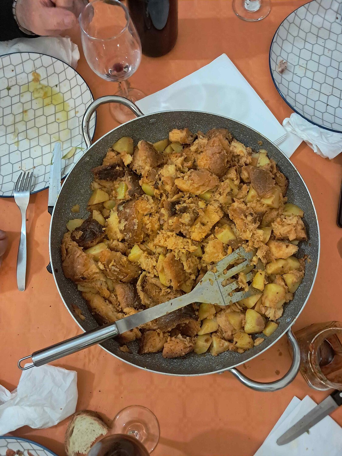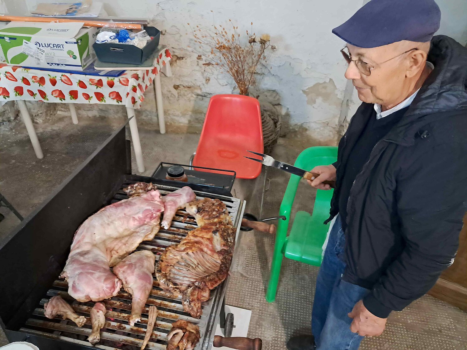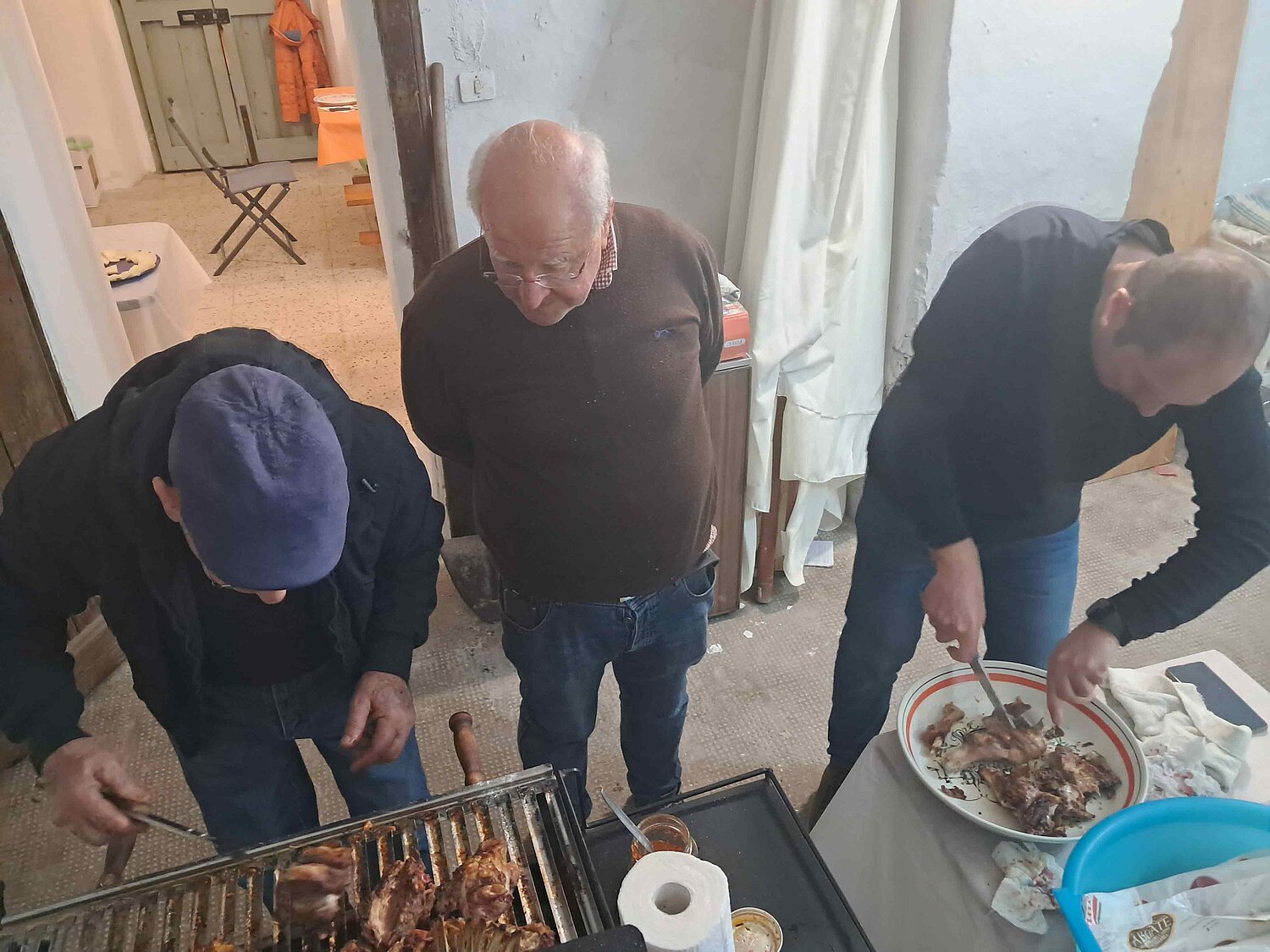 Abends treffen wir uns also bei Nicola, wo bereits ein Lamm auf dem Grill am Brutzeln ist. Papà Donato ist der Grillchef. Nicola seinerseits hat verschiedene Platten vorbereitet mit Käse, Salsiccia, Frittata und einen Topf mit einer Spezialität aus der Region, pane cotta. Ein Eintopf aus „altem“ Brot mit Kartoffeln und Tomaten. Eine „arme Leute“ Speise aus alten Tagen, die in der Basilikata noch heute gerne bei Festen aufgetischt wird und jede Familie ihr eigenes Rezept dafür hat. Ich kann euch sagen, einfach lecker und eine Superidee zur Verwertung von etwas in die Tage gekommenem Brot.